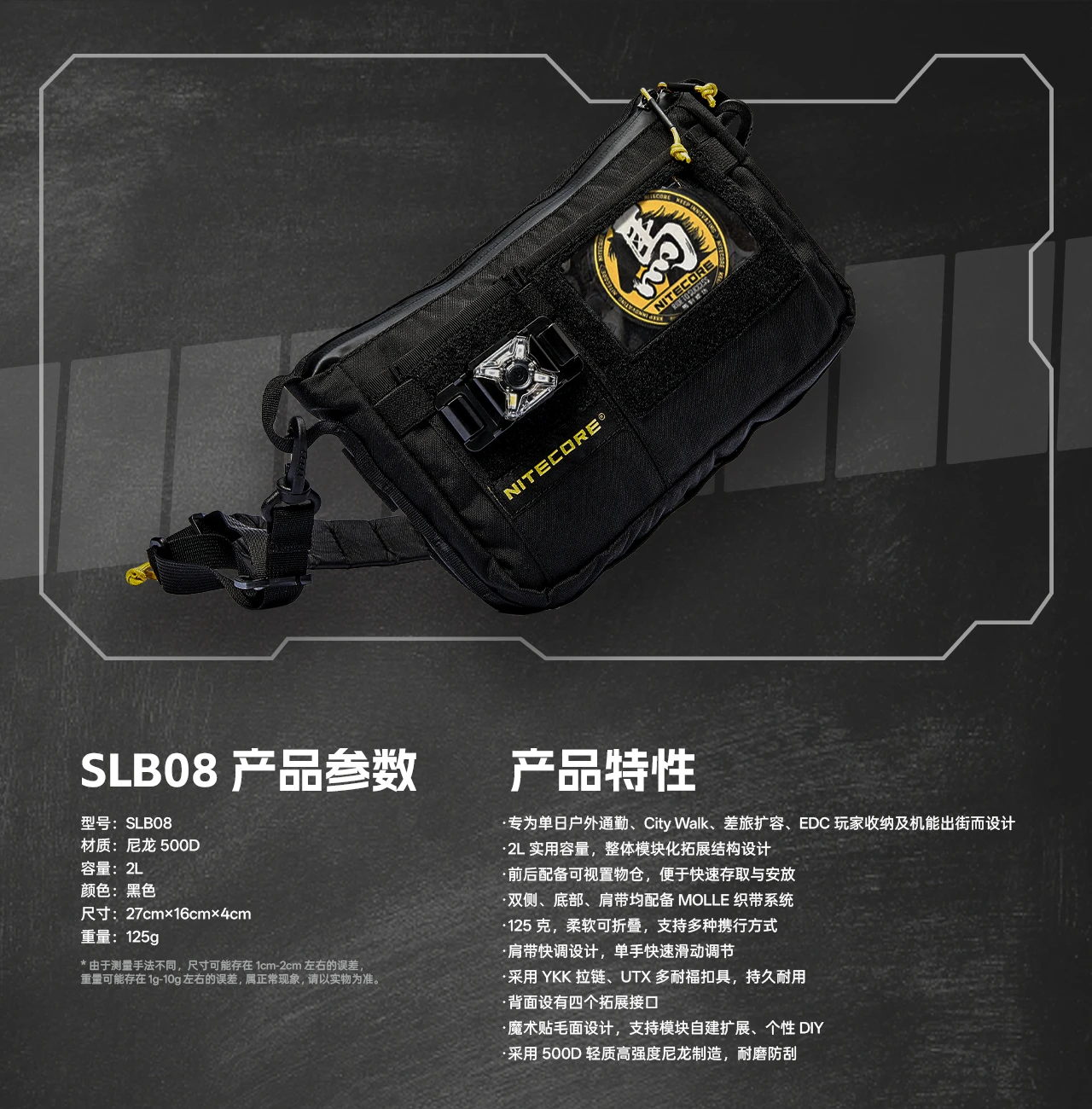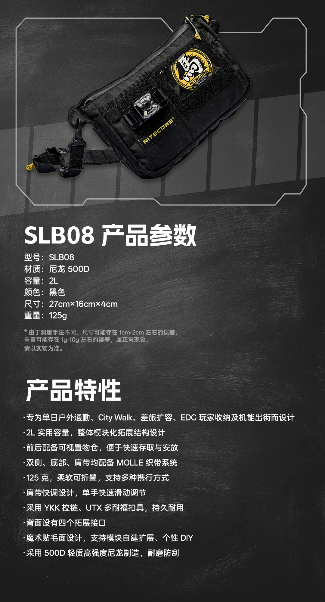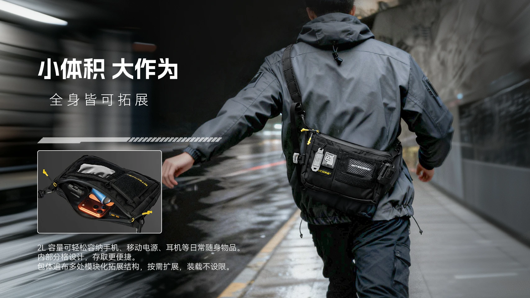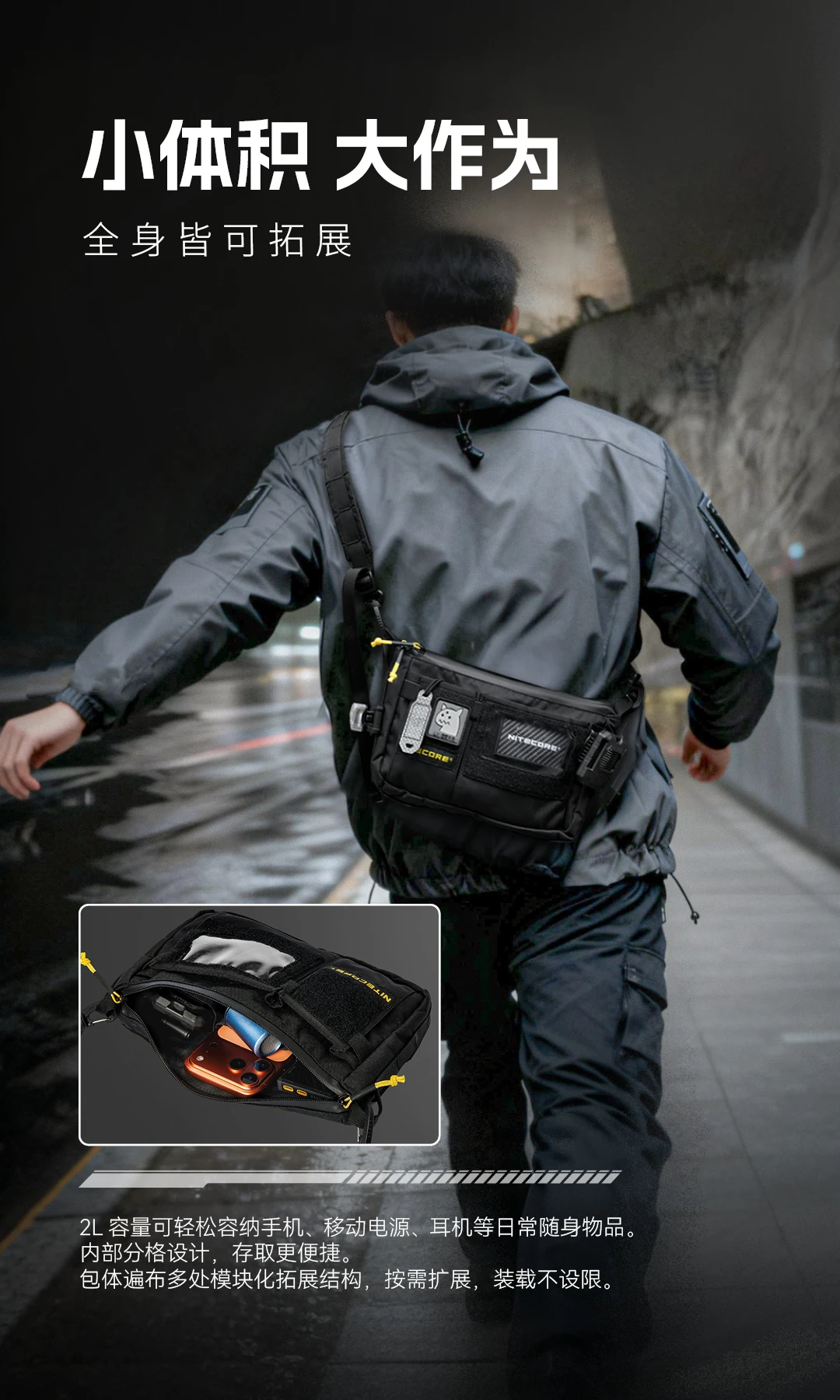 奈特科尔SLB08机能通勤斜挎包,包体柔软可折叠,仅重125克,拥有2升容量。配备可视双仓、魔术贴毛面,以及包体多点MOLLE拓展系统。配合多种背负方式,满足单日通勤、City Walk、差旅扩容备用及机能风搭配等多类场景需求。